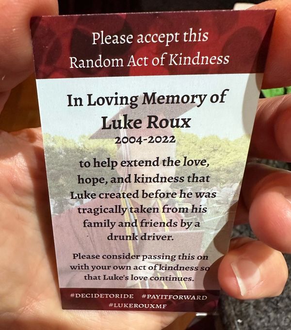 These kindness cards started as a way for Luke's family to spread the important message "Don't Drink and Drive. Decide to Ride." while honoring Luke. It wasn't long before some local friends asked for some cards, so they could do the same....