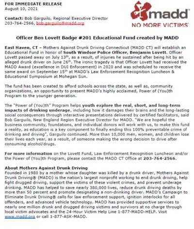 The Ben Lovett Educational Fund allows Mothers Against Drunk Driving to provide educational programming at schools and for community organizations around the state of Connecticut free of charge. The Lovett Fund is earmarked for the program, Power of You(th), to be presented in schools and community organizations statewide. The program examines the effects of underage drinking.